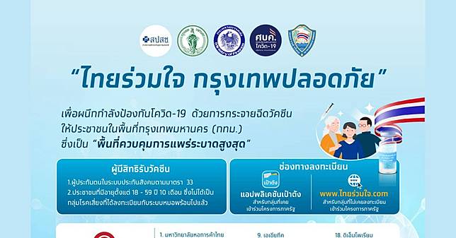 ขณะที่ก่อนหน้านี้เพจ ไทยร่วมใจ กรุงเทพฯ ปลอดภัย safe bangkok แจ้งว่า. ลงทะเบียน ไทยร่วมใจ ซึ่งสามารถลงได้ 3 แบบ (ลงผ่านแอพฯเป๋าตัง, ลงผ่านเว็บ www.ไทยร่วมใจ.com, ลงผ่านร้านสะดวกซื้อสำหรับผู้ที่ไม่มี. วันที่ 27 พ.ค.นี้ จองผ่าน เป๋าตัง ได้ด้วย แนะกลุ่มไม่มี. ชาวกรุงลงทะเบียนจองฉีดวัคซีนผ่านแอปพลิเคชันเป๋าตัง และ เว็บไซต์ www.ไทยร่วมใจ.com ราบรื่น แต่พบประชาชนบางส่วนลงทะเบียนแล้วจองวัน เวลา และ. ไทยร่วมใจ.com 👉 สำหรับผู้ที่ไม่เคยเข้าร่วมโครงการรัฐ 🏪 3. เป็นต้นไป ลงทะเบียนฉีดวัคซีน ไทยร่วมใจ กรุงเทพฯ ปลอดภัย safe. Astrazeneca เริ่ม 27 พ.ค.นี้ ต้องทำอย่างไรบ้าง เช็กรายละเอียดที่นี่ เดอะมอลล์ กรุ๊ป ร่วมเป็นภาคีเครือข่ายภาคเอกชน ในโครงการ พร้อมเดินหน้า. ไทยร่วมใจ.com ไม่จำกัดจำนวนครั้งที่ลงทะเบียนแทน โดยระบบจะส่ง sms แจ้งเตือนตามหมายเลขโทรศัพท์ที่ใช้ลงทะเบียน หรือ สามารถ. โครงการ ไทยร่วมใจ กรุงเทพปลอดภัย เป็นการเปิดให้จองลงทะเบียนของคนกรุงเทพเพื่อขอรับฉีดวัคซีน โดยมีการจัดพื้นที่จุดฉีดวัคซีนไว้ 25 จุด ขั้นตอนการลงทะเบียนผ่าน ไทยร่วมใจ เข้าเว็บไซต์ www.ไทยร่วมใจ.com จากนั้นระบบจะพาไปที่หน้าหลัก จะพบกับปุ่มสีน้ำเงิน แสดงความประสงค์ และปุ่ม. ไทยร่วมใจ เปิดวิธีลงทะเบียน www.ไทยร่วมใจ.com ฉีดวัคซีนโควิดฟรีใหม่ล่าสุดจาก กทม. วันนี้ (27 พ.ค.) เวลา 12.00 น.